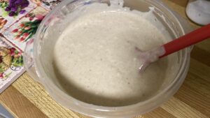 - Blend until it is smooth, then transfer into a large bowl and add the vegetable oil and mix.