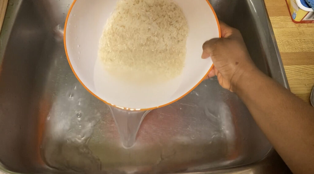 - Pour the rice in a bowl and rinse it continuously with room temp water until the water is clear, transfer to a sieve and set aside. (NOTE: Be careful not to leave it in water for too long otherwise, it will start breaking.)