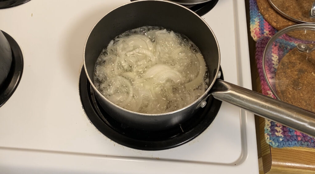 - Once the oil is hot, add the sliced onion and allow to sauté for about 2mins, make sure you stir it constantly and don’t allow it to burn or get brown.