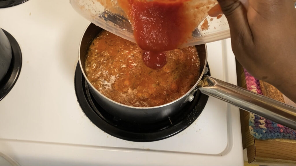 - Then add in the blended tomatoes mix and stir until it is thoroughly combined.