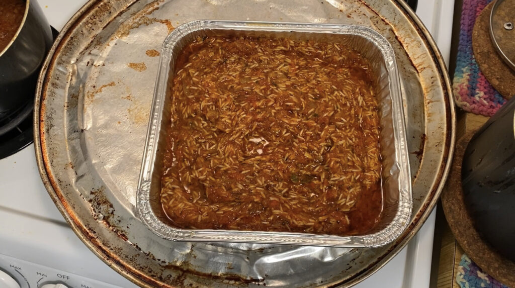 - In an oven safe pan, pour in the washed and drained basmati rice and pour in all the tomatoes sauce in plus 1/4 cup of water and stir.