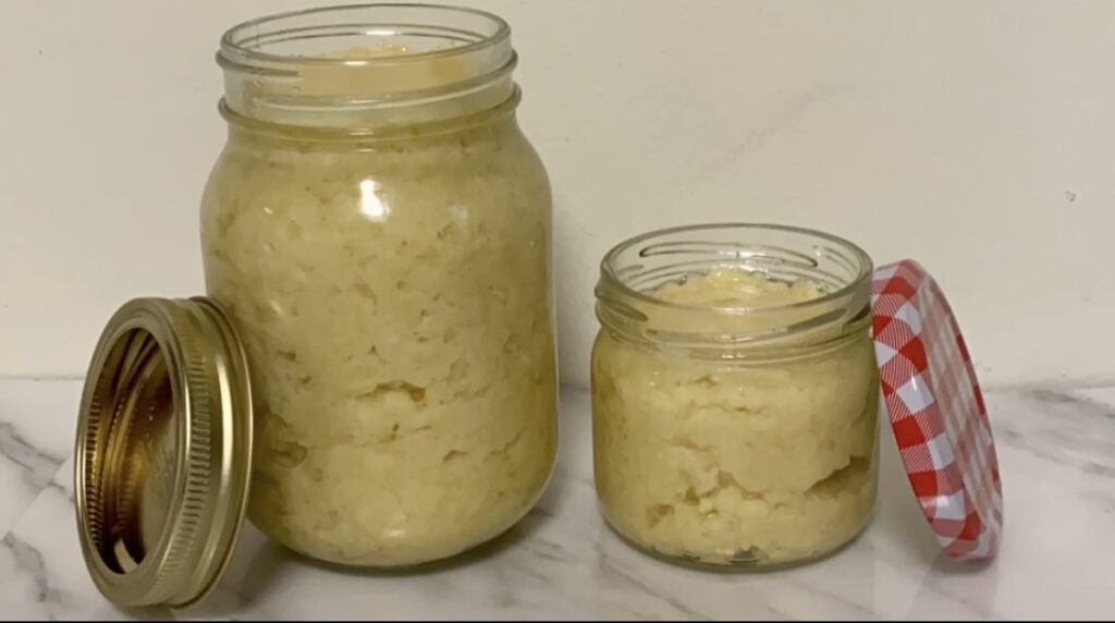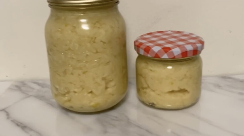 • Then gently pour into a jar or container, make sure the oil is to the top of the garlic paste and the jar or container is air tight so it doesn’t get brown.