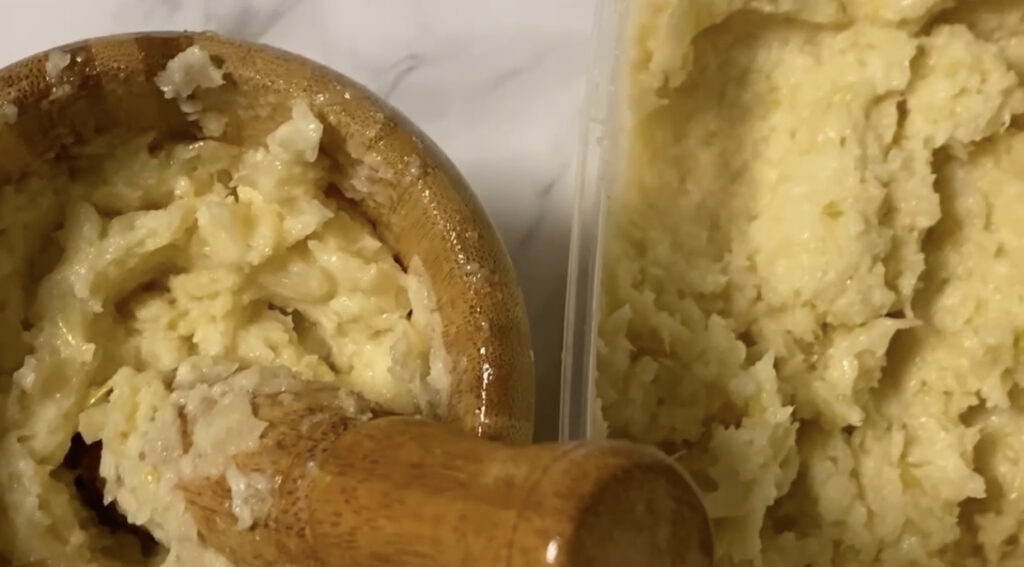 • Blend the garlic until it turns into a paste. (You can use a blender or pound in a mortal, Use half of the oil to blend or pound into a paste ***DO NOT ADD ANY WATER*** Blend in small batches if your blender or mortal can’t blend / pound all at once)