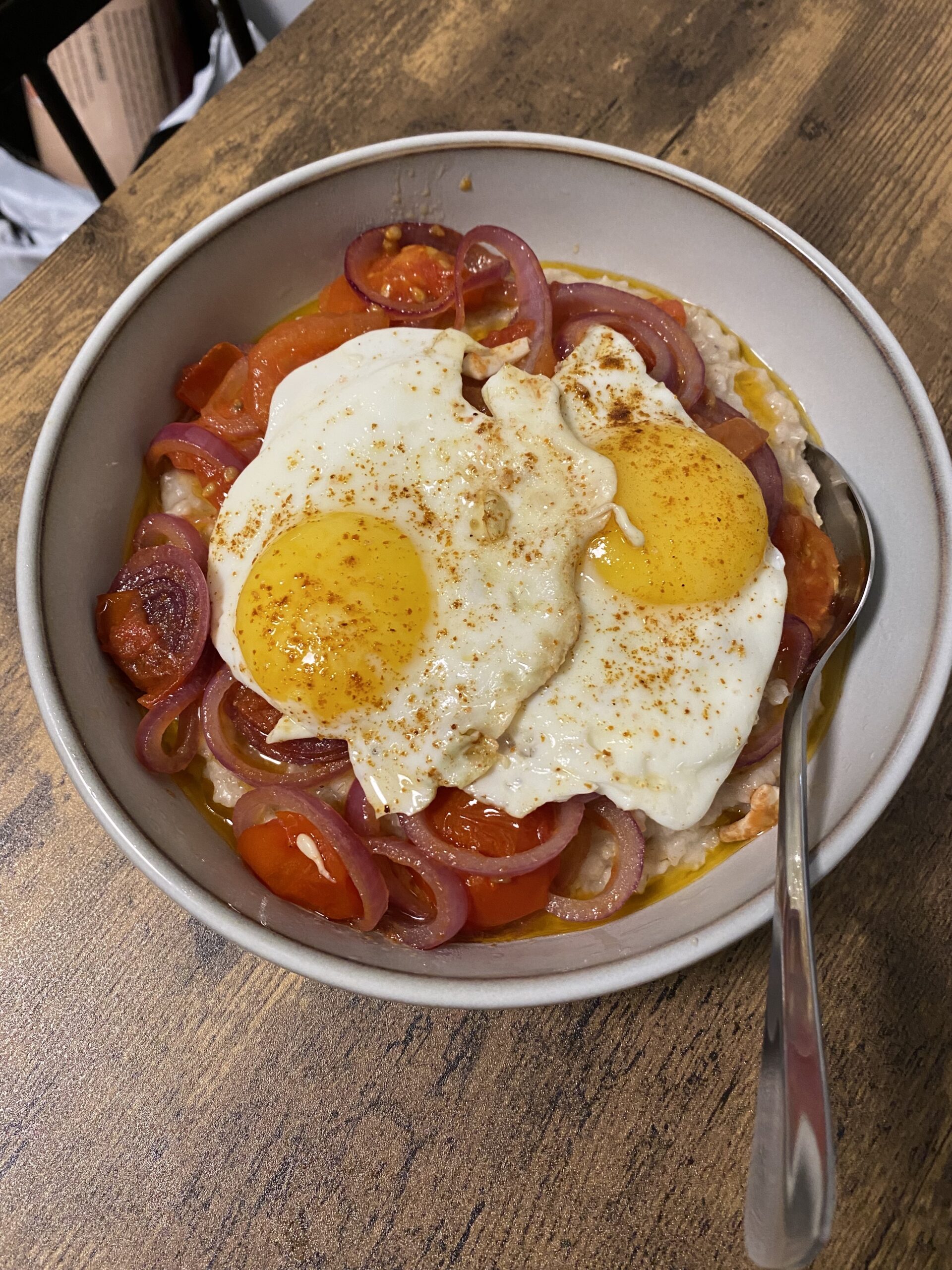 Savoury Oatmeal with Eggs, Sautéed Tomatoes and Onions