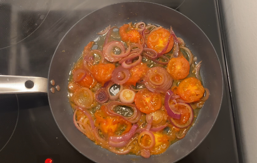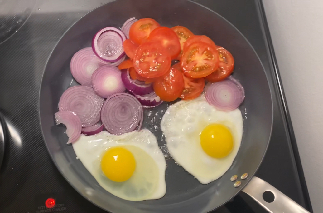 - If the frying pan is big enough then on the other half of the frying pan, add in the sliced tomatoes and onions. Keep an eye on the eggs so they don't over cook. Once the eggs are cooked, remove from the pan transfer to a plate and set aside.If the pan isn't big enough, wait for the eggs to cook then remove it from the pan and transfer into a plate and set aside. Add the tomato and onion into the pan.