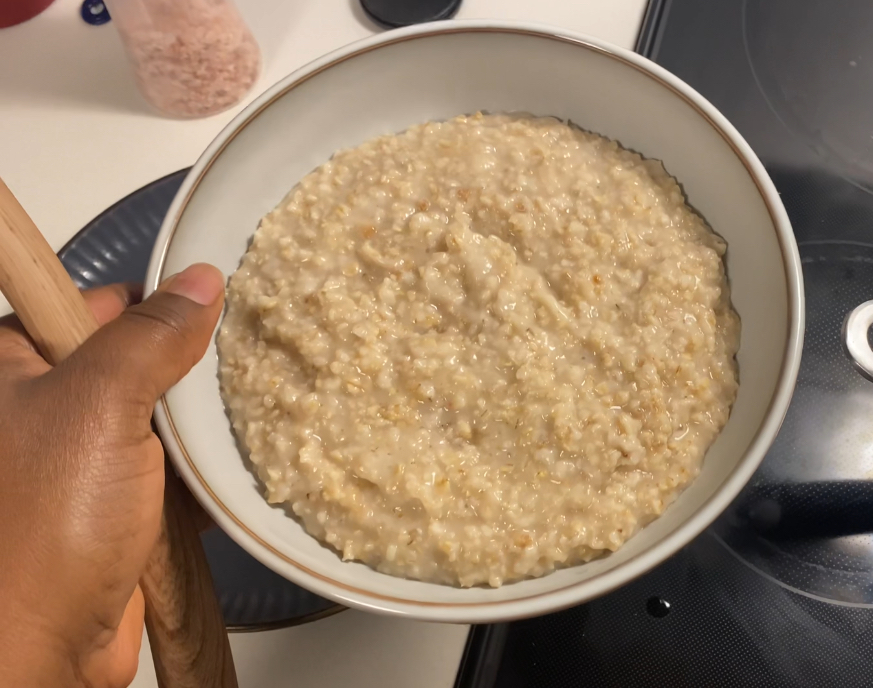 - Once the oat is cooked and it is to the consistency you want, not too thin and not too thick then remove from heat, transfer into a bowl and set aside.