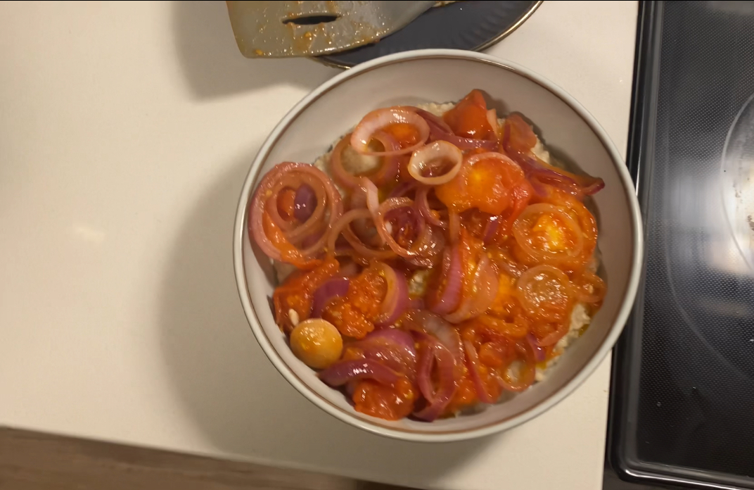 - Carefully pour the sautéed tomato and onion on top of the cooked oatmeal that you transferred to a bowl