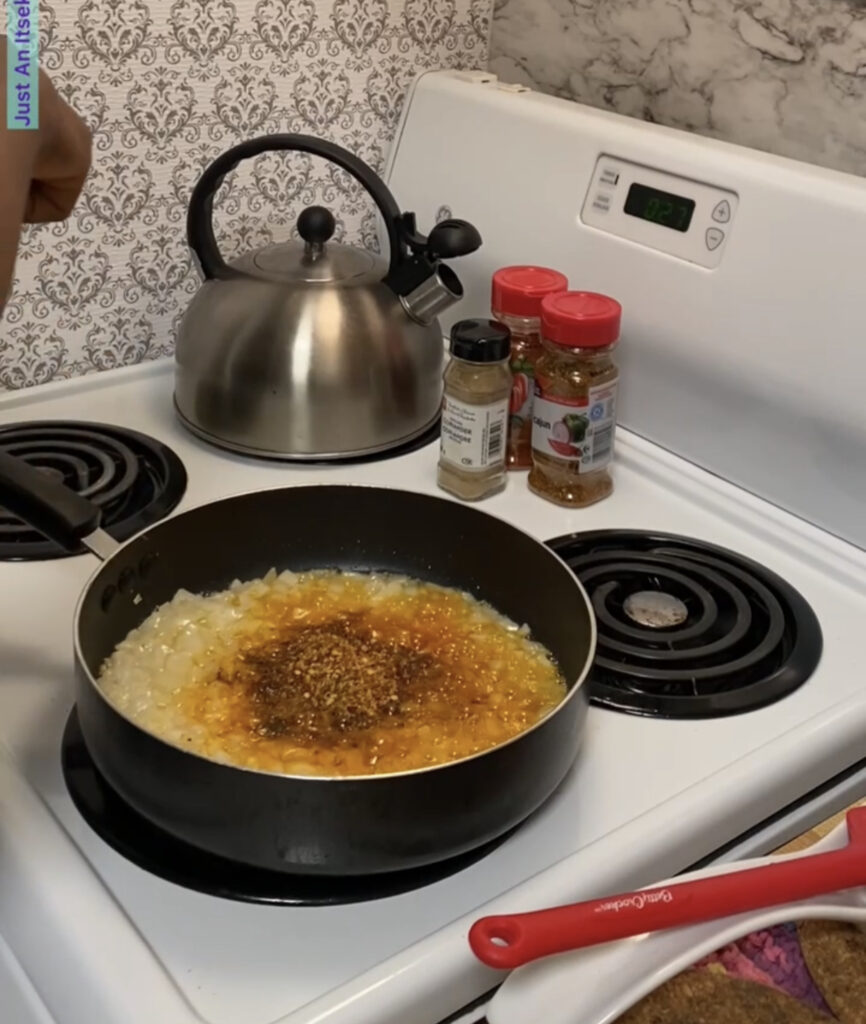 - Once it is hot, add the onions and let it sauté. (If using fresh garlic, add it at this stage).