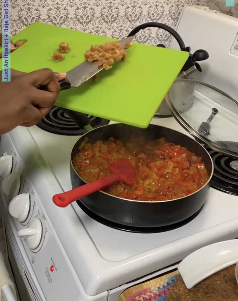 - Add the chopped tomatoes and the red bell peppers and stir, cover and allow to cook, stirring intermittently for about 15 to 20mins.