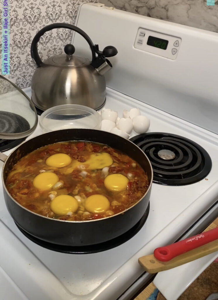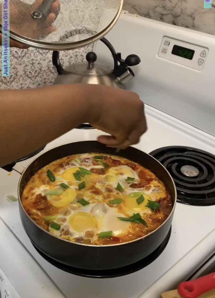 Shakshuka is eggs poached in tomatoes sauce. This meal is mainly indigenous to North Africans and Middle Eastern. It can be eaten any time of the day, from breakfast to lunch or brunch to dinner.